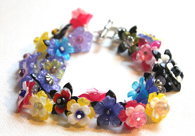 Maggie shared this easy double flowered rainbow hued bracelet tutorial on her blog, Stranger than Vintage. I really liked her idea of stacking 2 lucite flowers together. She used eye pins. Her design was confined to the front of the bracelet which will suit those who are a little more understated.